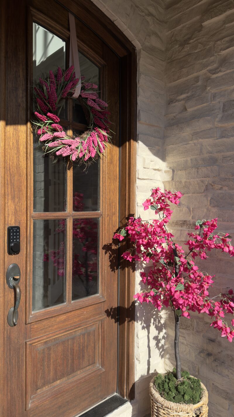 A rough photo because the sun was blaring down but I wanted you to see the wreath on the door. It looks really cute with the bougainvillea trees we have. They are currently on sale for a great price.