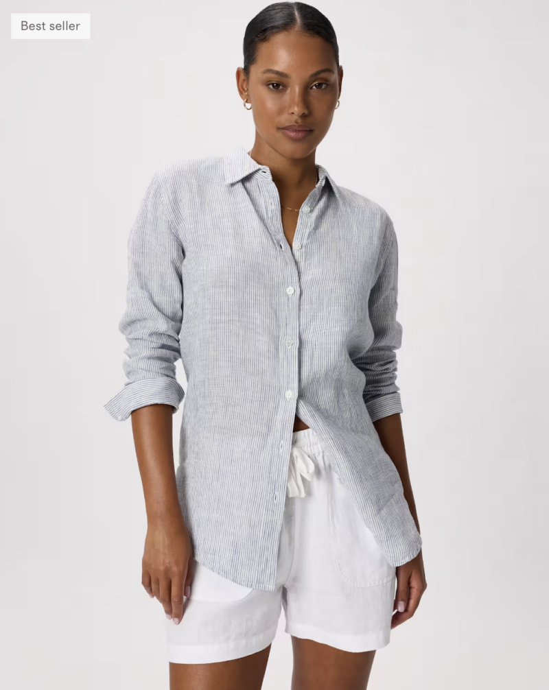 I wear this linen button down so often. Love the classic pin stripes. It comes in so many colors. Did you know linen is one of the most healthy fabrics you can wear. I’m going to add the white one to my wardrobe. I think it’s a good classic piece.