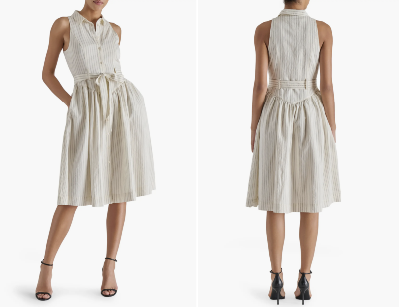 I love the cap sleeves and waist on this. It also comes in white for the summer which would be really pretty, too. I might order the white for when we head to the beach soon.