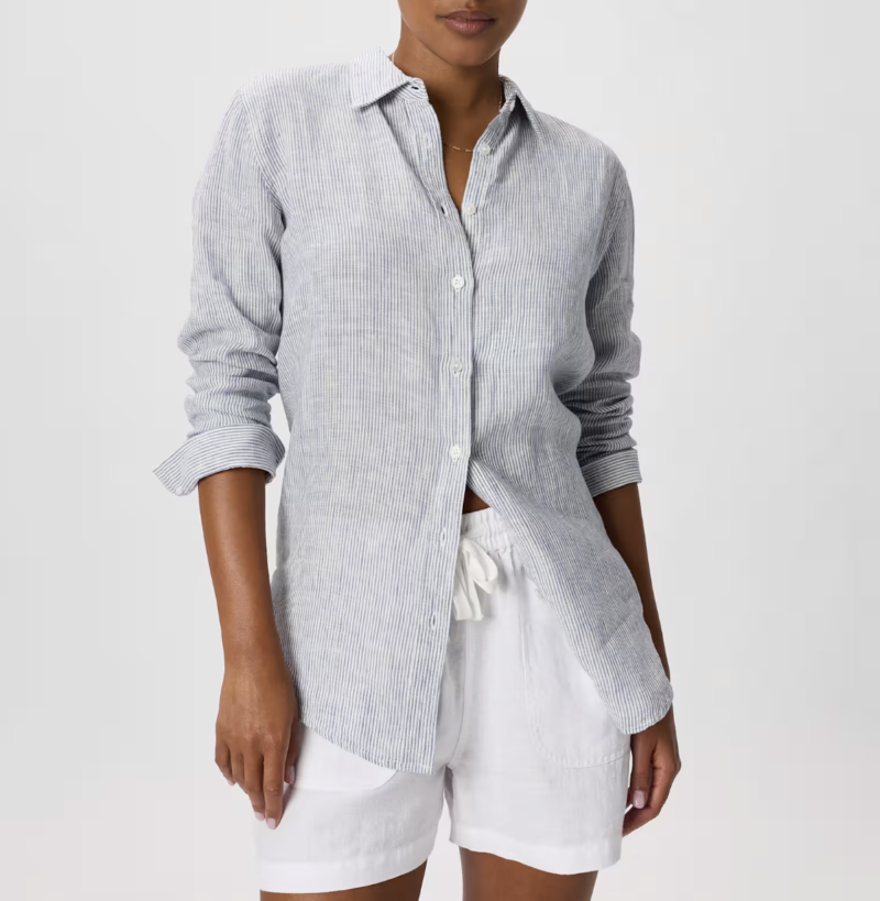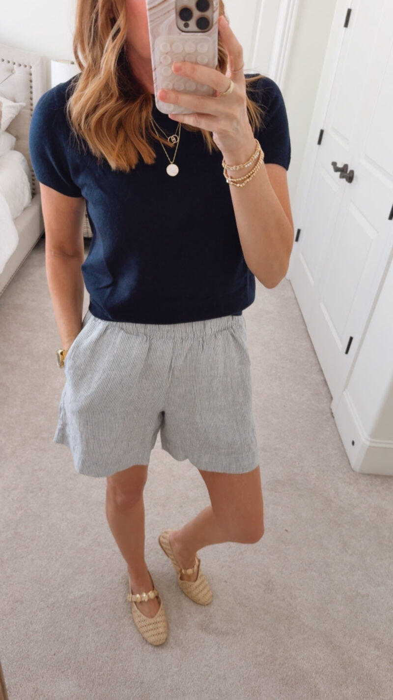 Here is the cashmere top paired with shorts. Highly recommend these linen shorts. You can wear them as is or fold over the waistband for a shorter look. Because of that, they are great for travel. This is the cardigan I always use for around my shoulders. It’s super soft and a great weight. Especially nice when every place here has the AC cranked up.