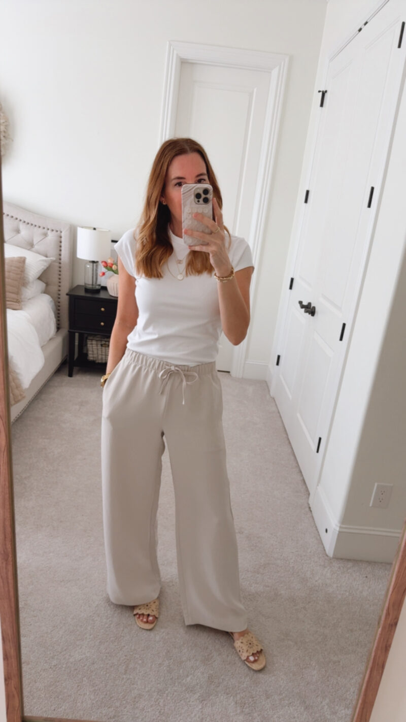 Speaking of drawstring pants. You guys!!!! These live up to the hype. After hearing so many great things. I had to try them myself. They are a 10/10. Truly a great pair of pants. They have a really pretty drape and flow to them. You can easily dress them up or down. Ideal for travel because they DO NOT wrinkle. I’m so happy I bought them and will be taking them on vacation with me. This color is Metropolis Taupe and it’s GREAT. They are true to size – I am wearing a small and I am 5’7″.