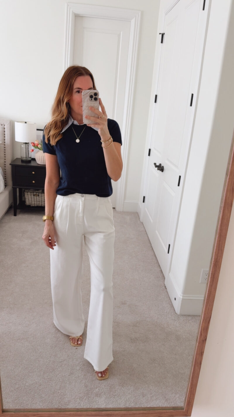 Ladies, I am in love with these white pants. They are sooooo good. Even my husband commented on them. They are lightweight and so comfortable to wear. These will be a summer staple. I am 5’7″ and wearing them with a small kitten heel. The cashmere top is also so lightweight and soft. You can find my striped collar here (don’t tell anyone it’s not a real shirt. . . they’ll never know).